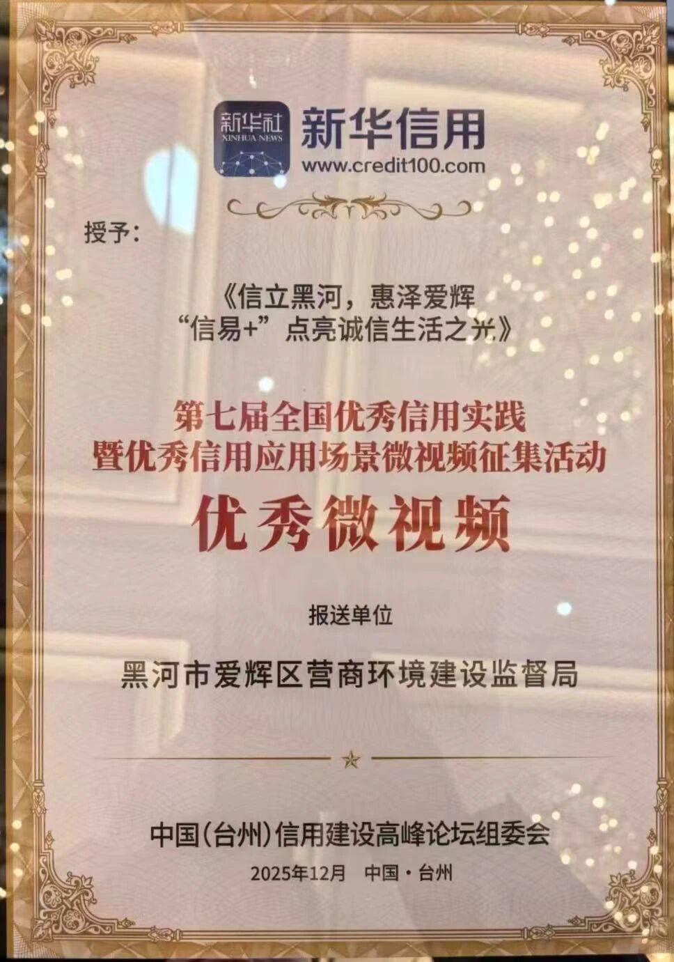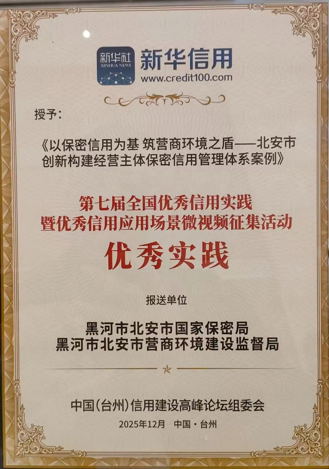 12月13日,由中国经济信息社、新华社浙江分社、台州市人民政府主办的第七届中国信用建设高峰论坛顺利召开,论坛上正式公布了第七届“新华信用杯”全国信用应用场景优秀实践及优秀微视频评选结果。由黑河市报送的《以保密信用为基筑营商环境之盾》作品荣获优秀实践;《信立黑河,惠泽爱辉“信易+”点亮诚信生活之光》作品荣获优秀微视频。
