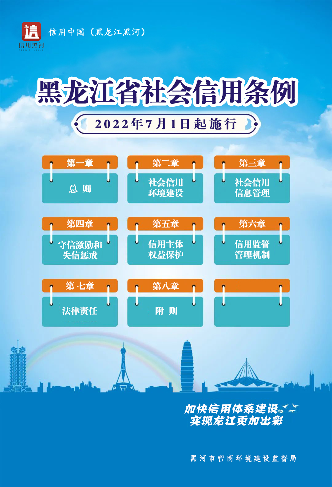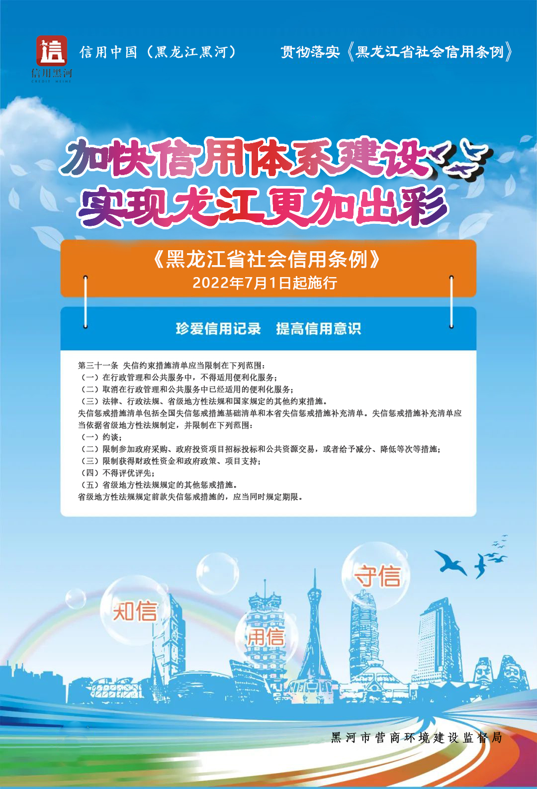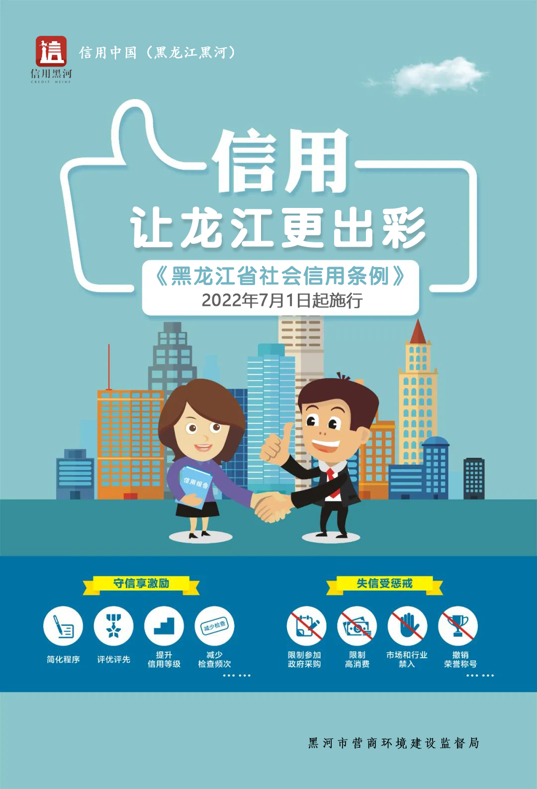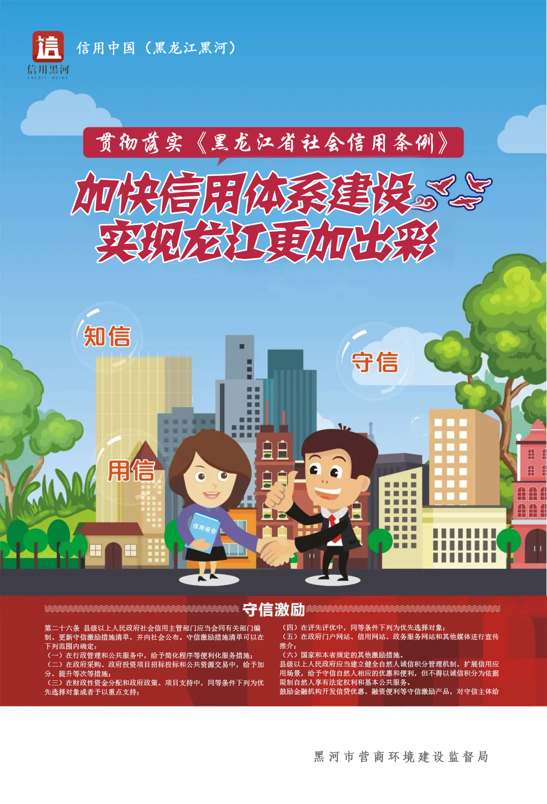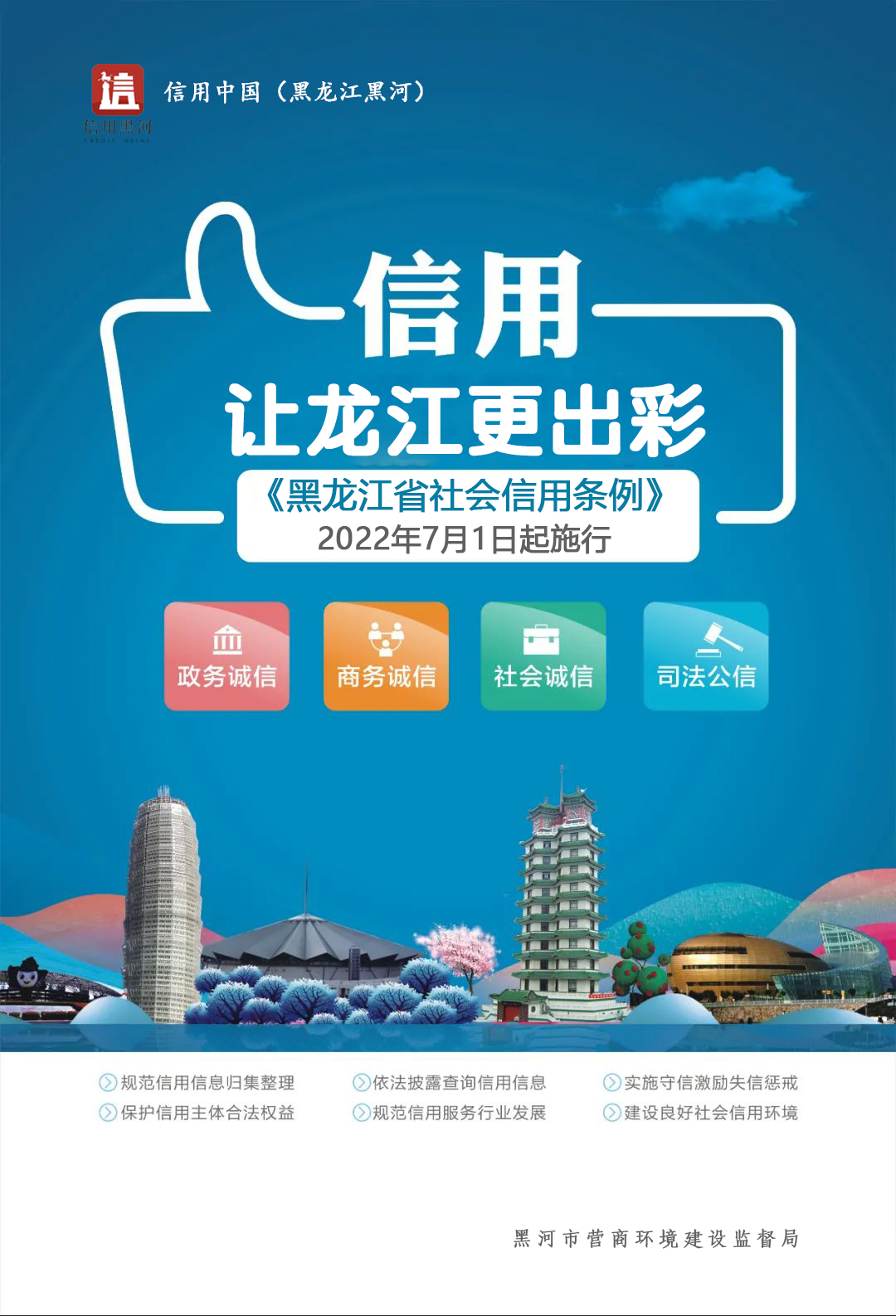 为全力以赴做好《黑龙江省社会信用条例》的宣传贯彻工作,扩大社会信用体系建设工作传播影响力,黑河市启动《黑龙江省社会信用条例》宣传周活动。