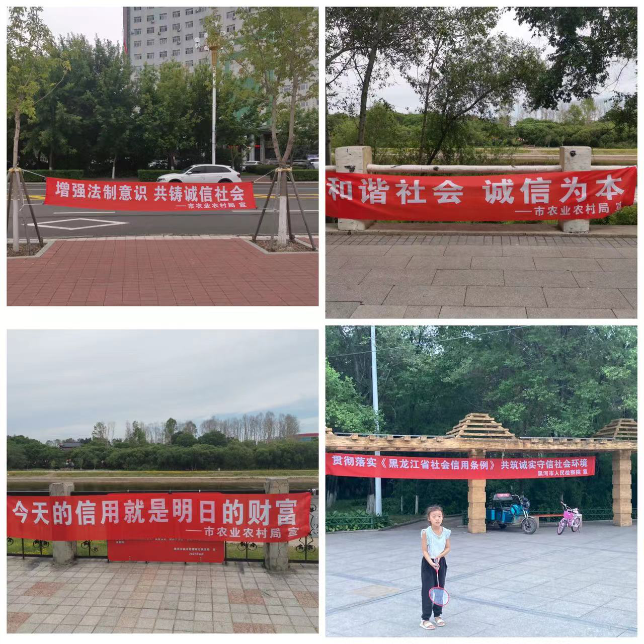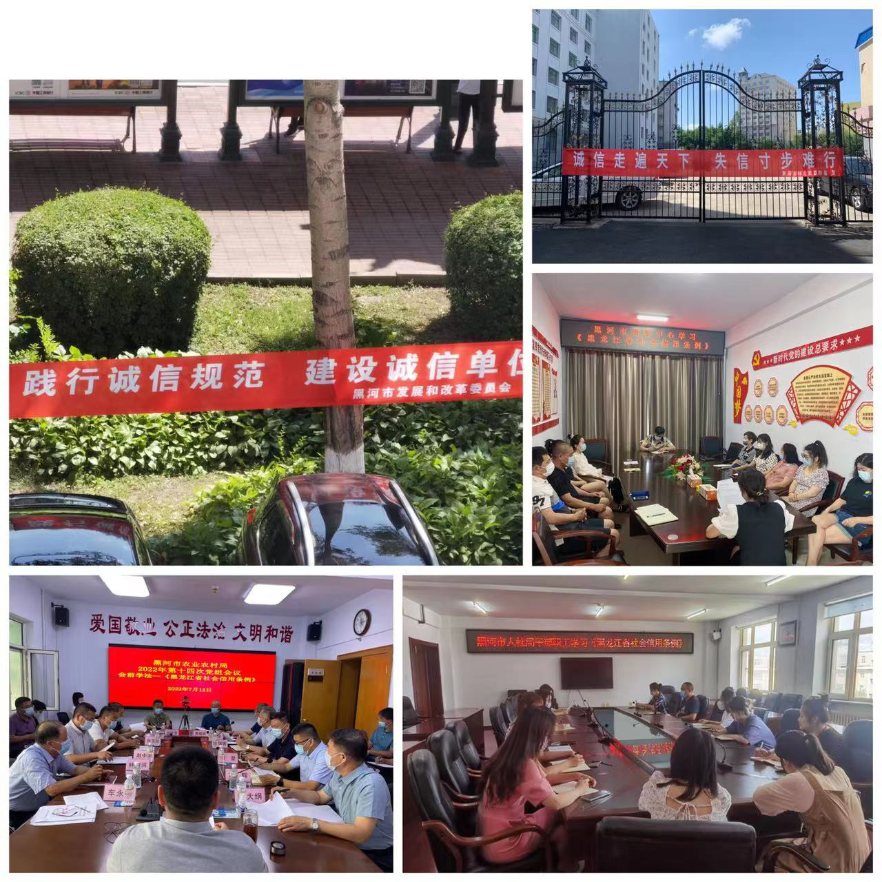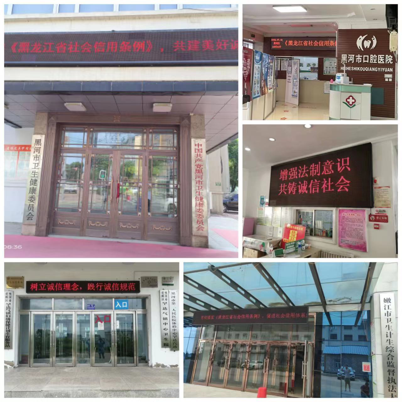 黑河市掀起了黑龙江省社会信用条例学习的浪潮,学习宣传文件下发后,全市各相关单位第一时间全面落实宣任务,通过领导干部带头学、党员干部自主学等方式,全面深入的学习了《黑龙江省社会信用条例》,截至目前,市发改委,市农业农村局、市中院、市人民检察院等20余家单位,制作诚信标语条幅30余条,LED屏幕300余次,全市各相关部门引导各领域企业引导企业增强诚信守法意识,宣传“诚信经营”的重要性,提升企业诚信经营水平。黑河市政务中心、黑河市卫健委等具有大厅窗口的单位通过大屏幕及窗口,积极向办事企业和群众普及信用知识,指引办事群众树立诚信自律、文明守礼的理念。其中,卫健委累计信宣传140次,LED屏播放宣传标语120余条,发放宣传材料2100余份。