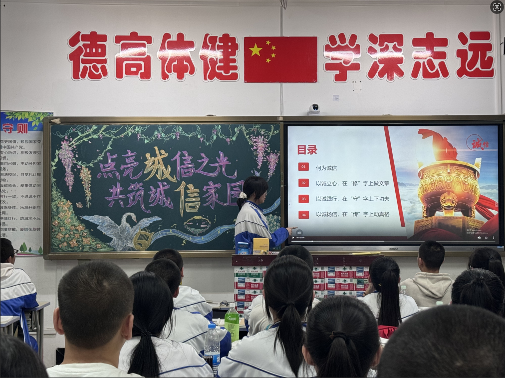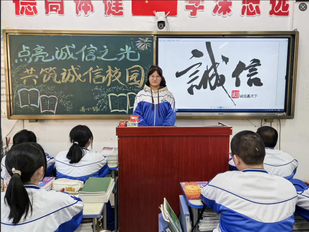 活动中,各班级组织召开了诚信主题班会——《点亮诚信之光 共筑诚信校园》,通过生动的故事、真实的案例,引导学生认识到诚信的重要性,激发了他们守信用的自觉性和主动性。同时,学校电子屏循环播放着诚信主题的标语,如“创诚信校园 树诚信学风 做诚信学生”“诚信立身,信誉立业”,这些标语简洁有力,时刻提醒着师生们坚守诚信原则。