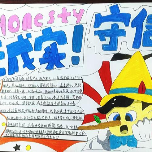 学生们还积极参与诚信主题手抄报与剪纸活动创作,学校对学生作品进行评选,对优秀作品进行展示。手抄报作品紧扣主题,版面设计新颖,内容涵盖诚信名言警句、诚信小故事、诚信标语等。有的以鲜艳色彩描绘“诚信之花”绽放校园,有的用漫画形式讽刺失信行为,直观展现诚信的价值与意义。